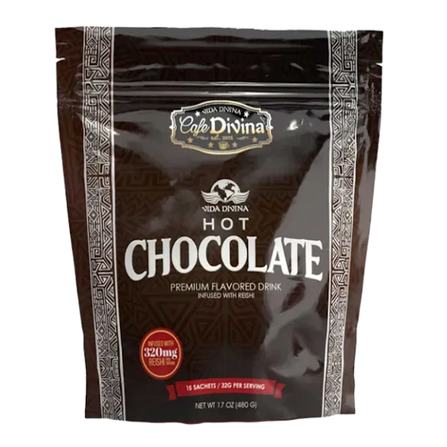 Azúcar de caña pura, crema no láctea [sólidos de jarabe de glucosa, grasa vegetal (aceite de palma), caseinato de sodio (un derivado de la leche), fosfato dipotásico, trifosfato pentasódico, dióxido de silicio, mono y diglicéridos y riboflavina], cacao en polvo, extracto de malta, extracto de reishi orgánico certificado 100 % puro (320 mg).
