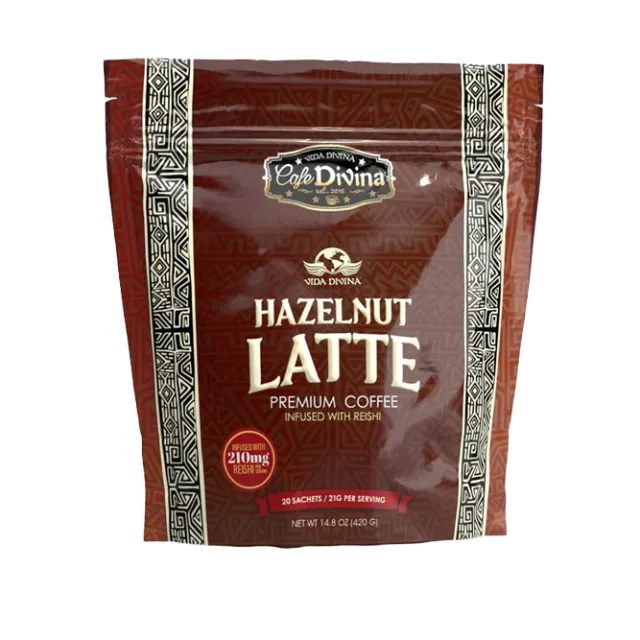 Azúcar de caña pura, crema no láctea [sólidos de jarabe de glucosa, grasa vegetal (aceite de palma), caseinato de sodio (un derivado de la leche), fosfato dipotásico, trifosfato pentasódico, dióxido de silicio, mono y diglicéridos y riboflavina], café arábica orgánico instantáneo, extracto de reishi y polvo con sabor a avellana.